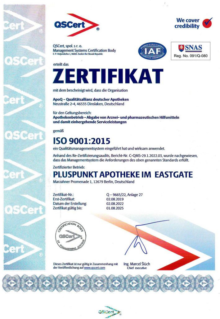 Als öffentliche Apotheke stehen wir tagtäglich für unseren gesellschaftlichen Auftrag – die sichere Arzneimittelversorgung – ein. Wir erfüllen mit unserer hochqualitativen pharmazeutischen Dienstleistung eine wichtige, öffentliche Aufgabe. Die langjährigen Beziehungen zu unseren Kunden helfen Gesundheitsfragen ganzheitlich zu klären und den Erfolg der Apotheke zu sichern. Wie verpflichten uns zur Einhaltung aller zutreffender gesetzlichen Anforderungen. Neben diesen leben wir unser eigenes Qualitätsmanagement- System, um noch höhere Standards zu erfüllen. Das System gem. ISO 9001 lassen wir extern überwachen und zertifizieren.